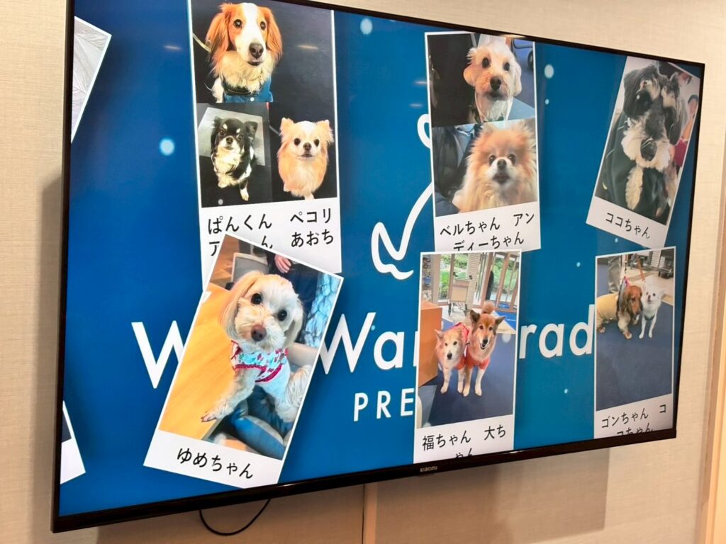 撮影した写真は、モニターに映し出され、当日の宿泊わんちゃん紹介に登場しました。